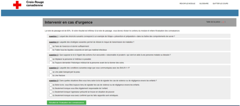 Our courses are modular. Each module includes activities to help you check your understanding of the concepts being taught. At the end of each module, you'll complete a short knowledge evaluation consisting of multiple-choice questions.