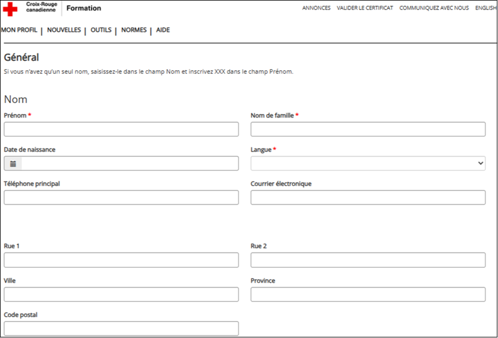 4. Le portail vous redirigera vers la page Mon profil. Remplissez les champs obligatoires et facultatifs (certains champs obligatoires pourraient déjà contenir vos renseignements).