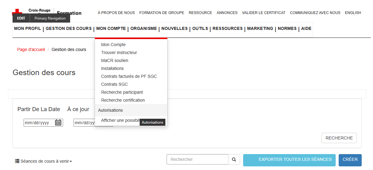3. À partir de la page d’accueil Formation, cliquez sur MON COMPTE, puis sur Autorisations dans la barre de navigation principale.